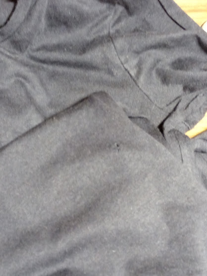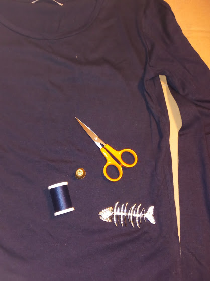 Comprei uma camisola simples, mas depois de a vestir uma vez reparei que tinha um pequeno buraco. Como o tapar? Andei a ver o que poderia ser e, descobri um peixe que tinha guardado, que seria perfeito para aplicar. Problema resolvido... Camisola pronta a usar, de novo.