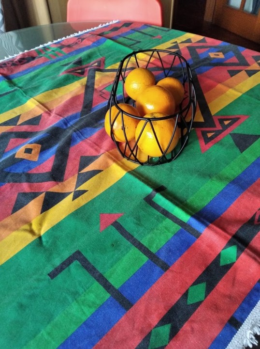 A minha mãe comprou o tecido na feira, não sei com que objectivo. Eu quando o vi apaixonei-me por ele, namorei-o e consegui convencê-la a deixar-me fazer uma toalha de mesa. Assim foi.